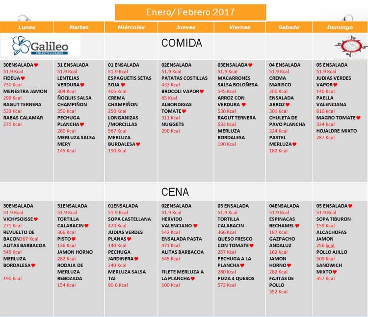 Menú de la residencia Anunciata en la primera semana de febrero del 2017